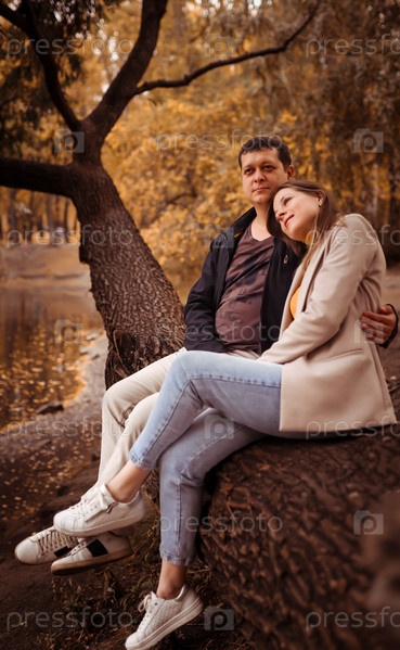 Молодая влюбленная пара на открытом воздухе. Потрясающий чувственный портрет молодой стильной модной пары, вид сбоку в парке осенью у озера