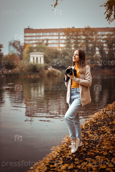 Красивая молодая женщина-фотограф с камерой в осеннем парке у озера. Улыбающаяся девушка наслаждается осенней погодой, образом жизни
