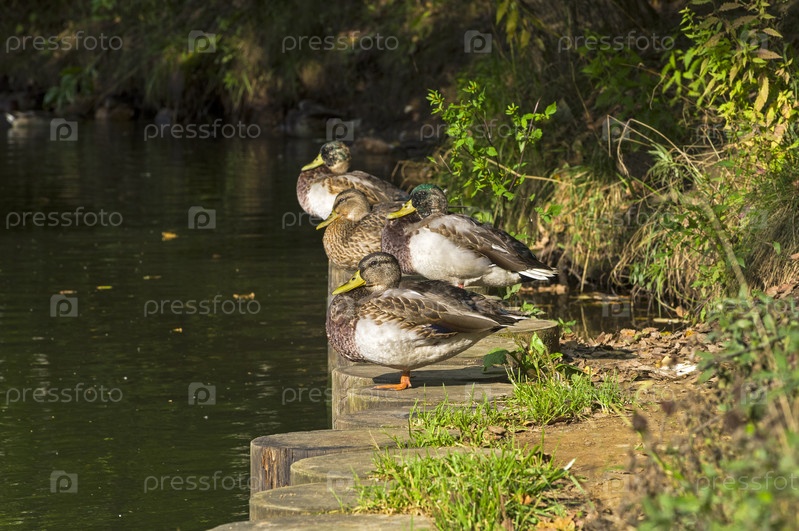 Утки-кряквы на берегу пруда. Солнечный день в сентябре. Москва, Теплостановский лесопарк
