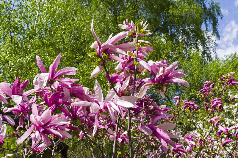 Цветущая лилиецветная магнолия (Magnolia liliiflora) сщкеф 'Сюзанна'. Аптекарский Огород (филиал ботанического сада МГУ), Москва