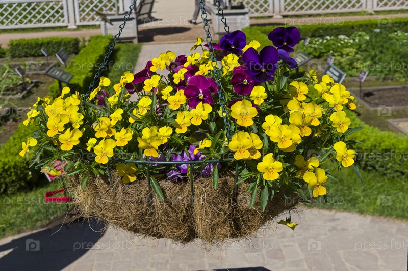 Корзина с цветущей фиалкой трехцветной ('анутины глазки' или viola tricolor) как украшение в парке