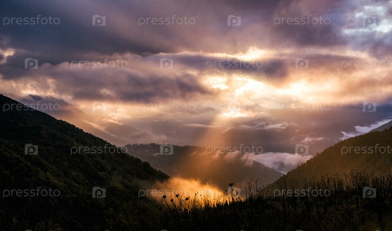 Сказочный пейзаж с драматическим небом и солнечным лучом в горах