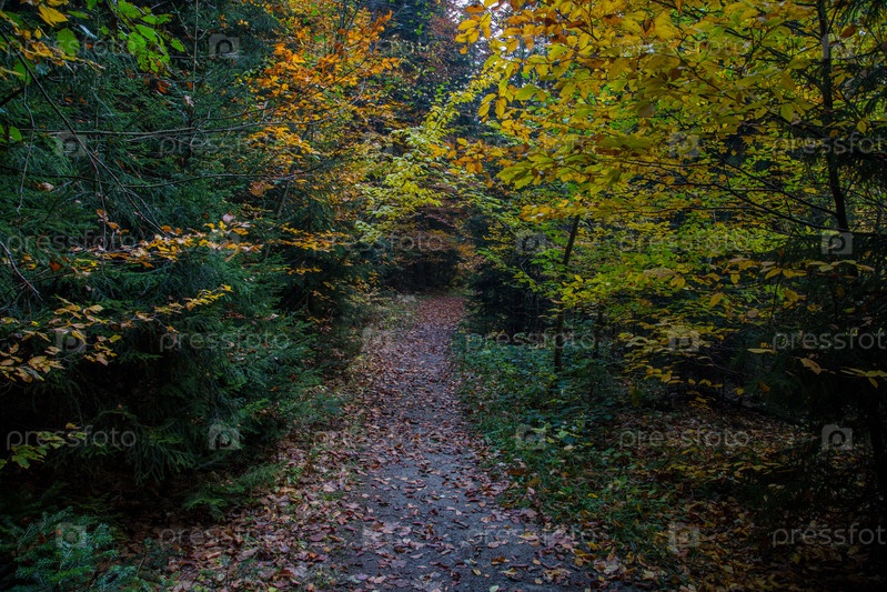 Тропинка в осеннем лесу усыпанная опавшими разноцветными листьями