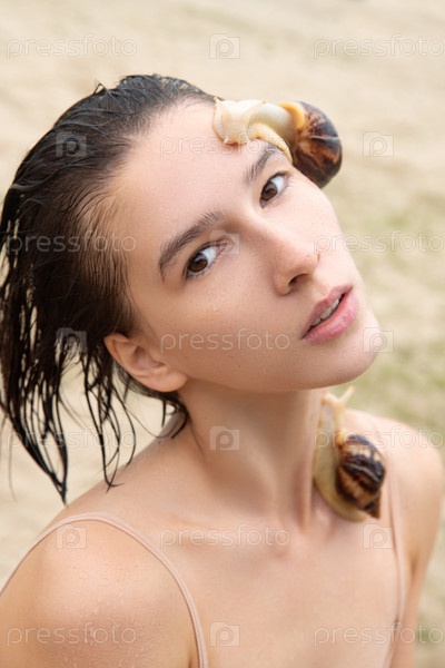 Девушка с улитками на лице. это очень необычно! Вы можете использовать эти фотографии для журнала, органической косметики и т. д