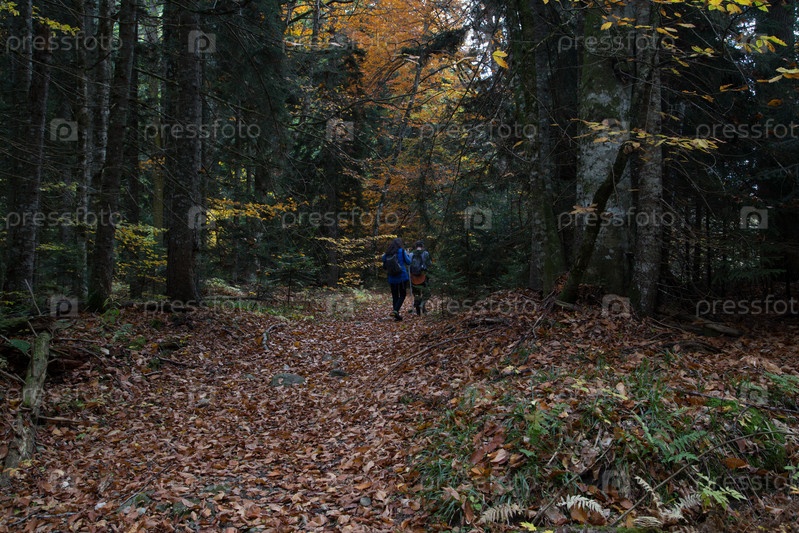 Пара туристов идет по тропинке в осеннем лесу усыпанной опавшими разноцветными листьями