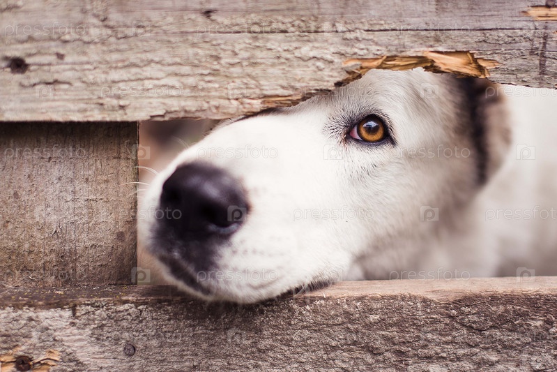 Белый пес породы алабай сморит сквозь дыру в заборе