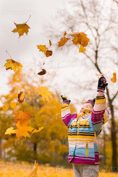 Девочка подбрасывает осенние листья