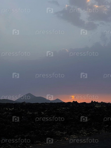 Черный песок Лансароте Канарских островов, дюны, холмы и редкие растения на фоне голубого неба