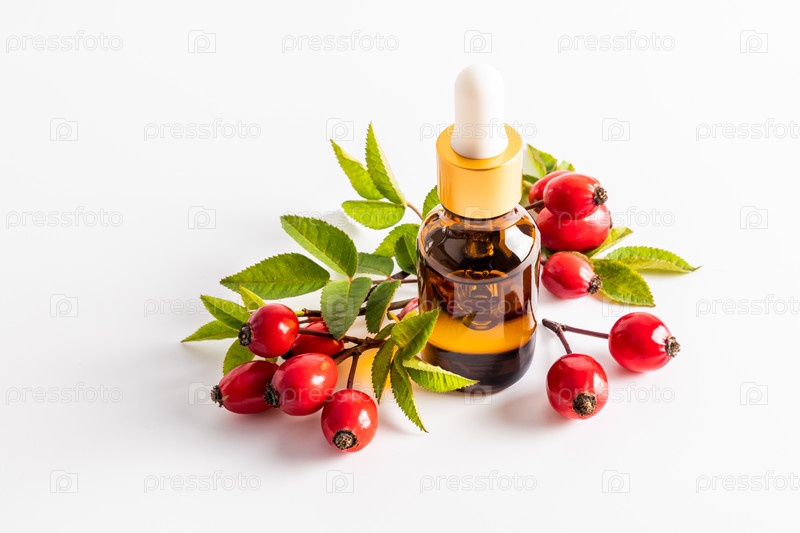 Косметическая бутылка с пипеткой с органическим маслом семян шиповника среди спелых фруктов на белом фоне. натуральная косметика по уходу за кожей. Пустой макет