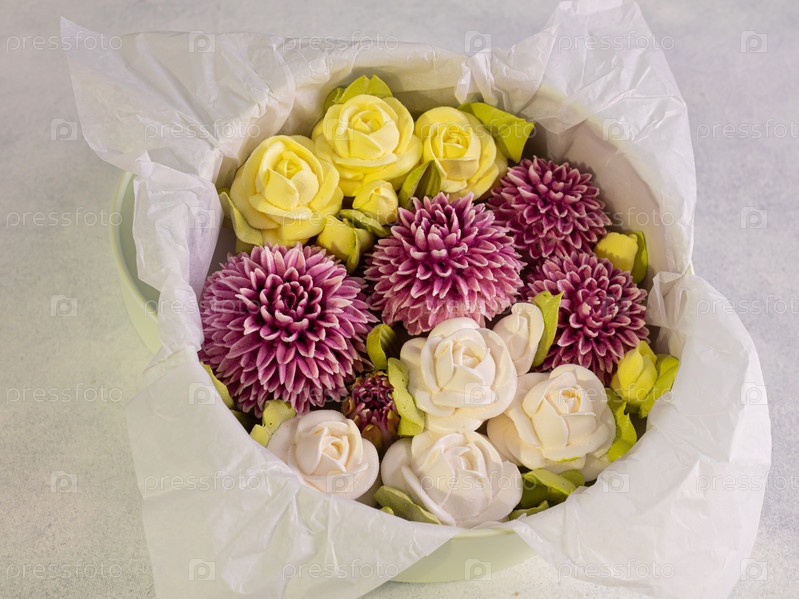 Зефирный букет цветов в подарочной коробке на светлом фоне, День святого Валентина