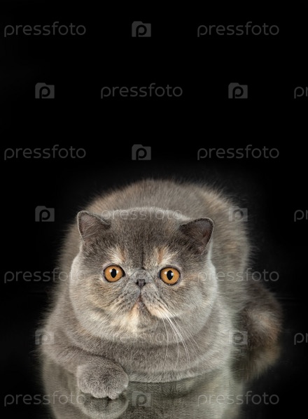 Красивая экзотическая короткошерстная кошка играет на темном студийном фоне с отражением. Окрас серый черепаховый