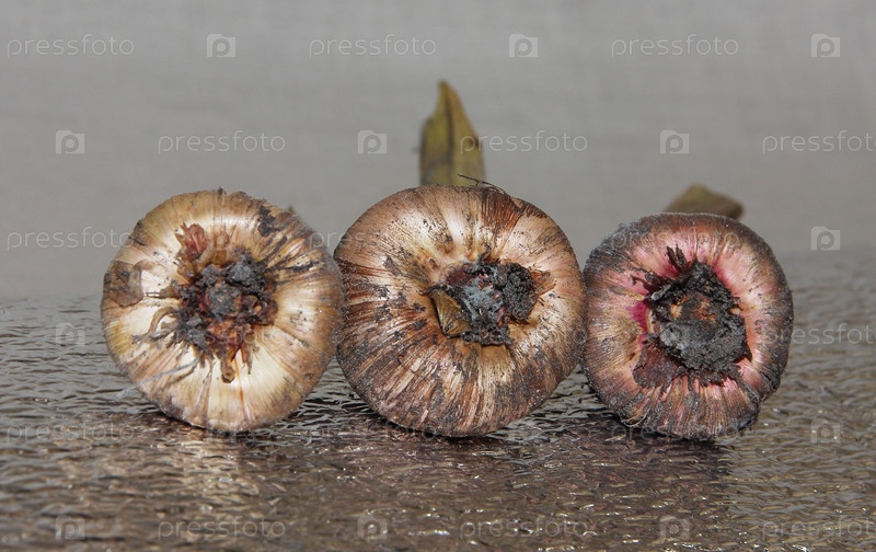 Три луковицы цветов гладиолусов разных сортов на серебряном фоне
