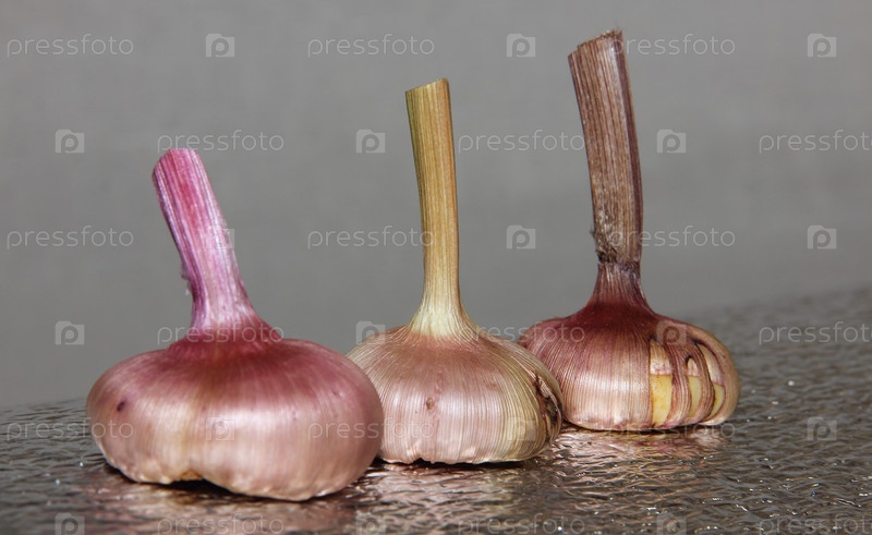 Три луковицы цветов гладиолусов разных сортов на серебряном фоне