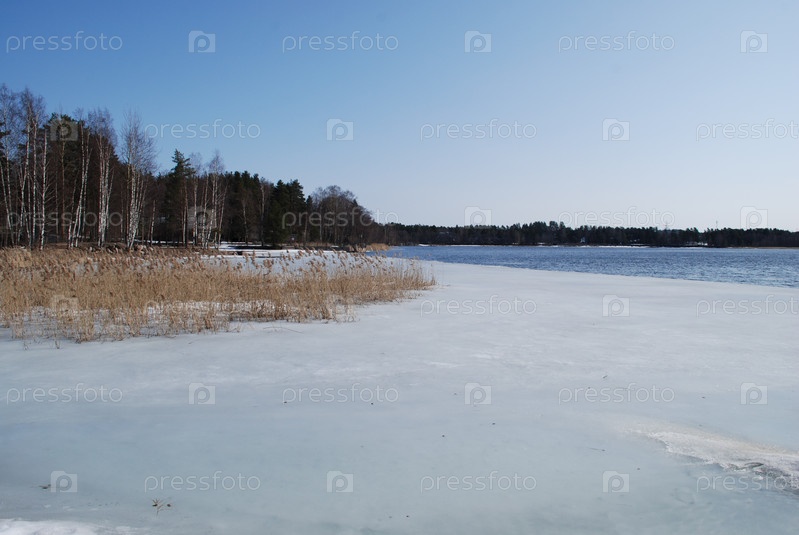 Заснеженный берег реки и лед на краю побережья. Весенний солнечный день, берег реки. Голубое небо и голубая вода, где нет льда. Во льду мокрая сухая озерная трава и камыши. Некоторые деревья