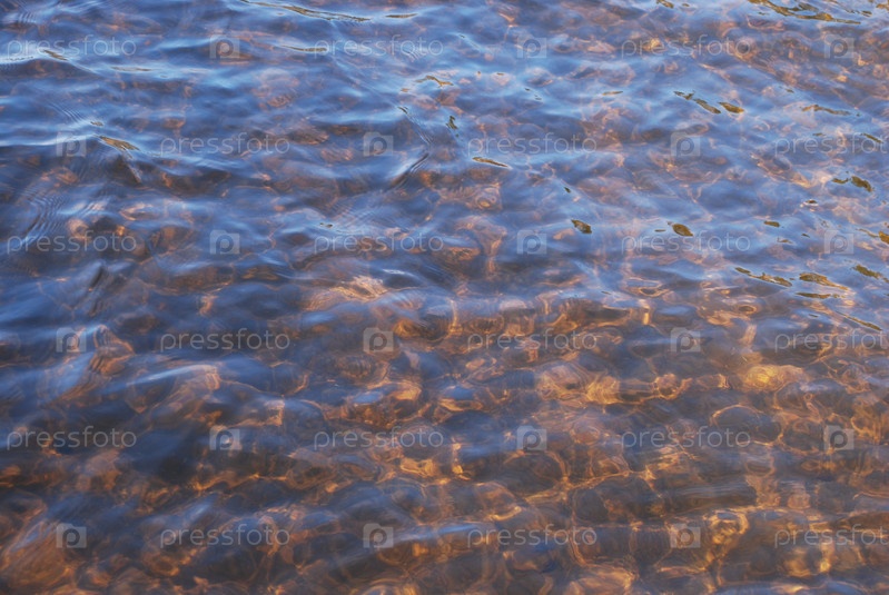 Поверхность чистой воды с небольшими волнами. Крупный план чистой речной воды с коричневым дном из песка. Отблески солнечных лучей окрашивают дно реки в золотистые тона