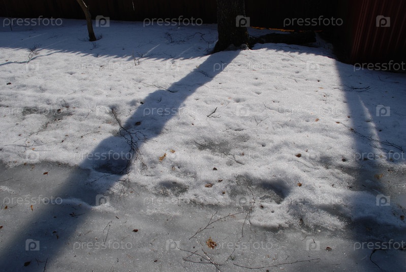 Два разных весенних снега. На земле лежит снег, который начал таять, посередине белый снег, в котором опавшие хвои, вокруг серый снег, пропитанный количеством воды