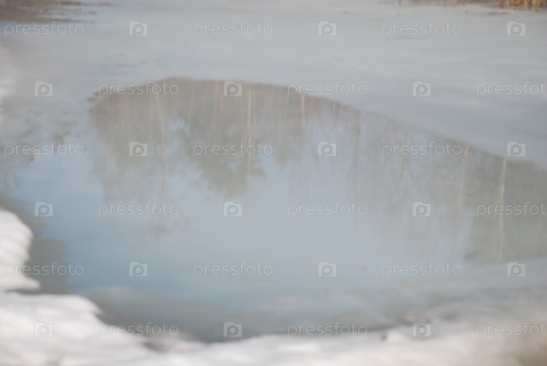 Лужа воды в снегу со льдом. Растаявший снег лежит на льду на воде. Сверху снег растаял, образовав лужу воды, в которой отражаются светло-голубое небо и деревья, растущие на берегу