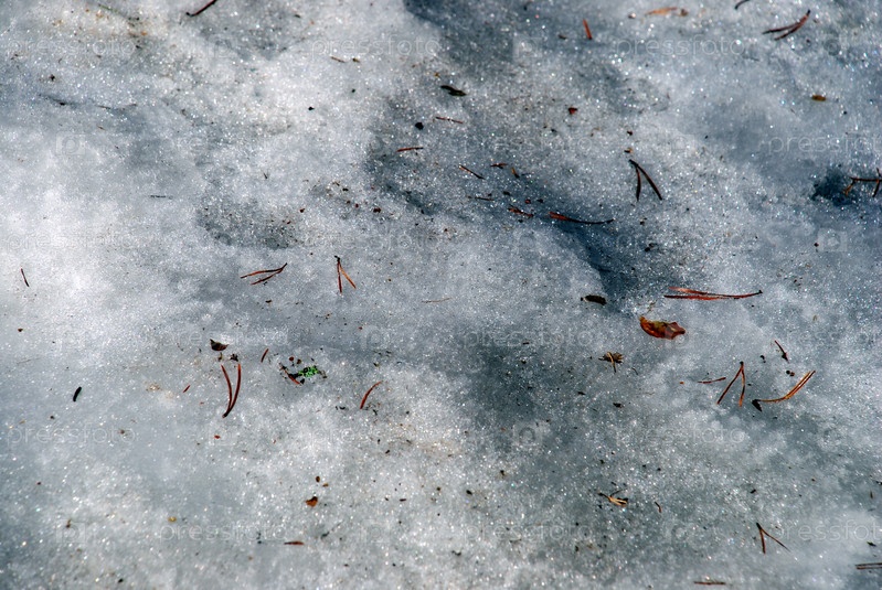 Растаявший бело-серый снег под весенним солнцем. Ранней весной на земле лежит рыхлый мокрый тающий снег. Опавшие коричневые сосновые иголки и кора в снегу