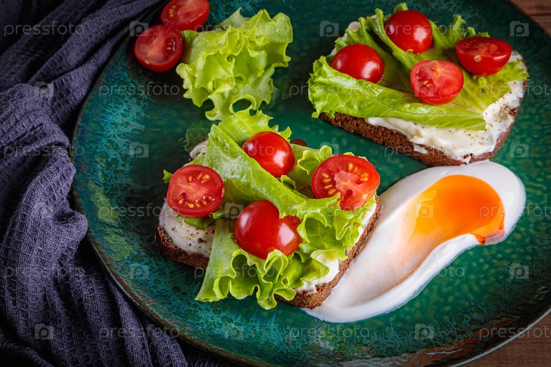 Сэндвич с черным хлебом с салатом из плавленого сыра и помидорами на зеленой тарелке