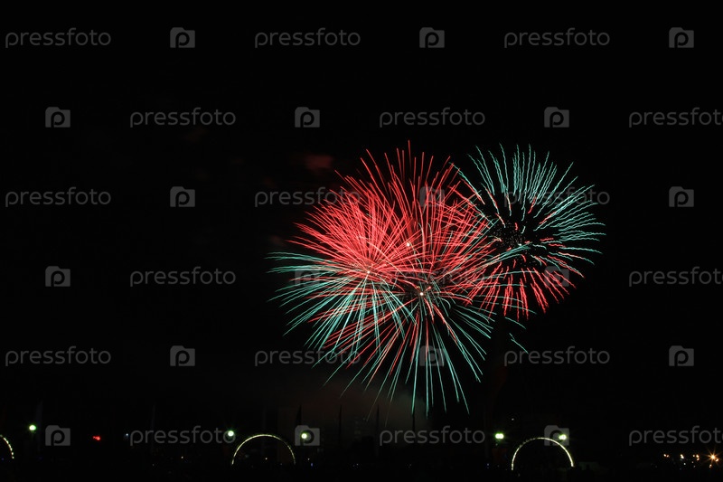 Разноцветный фейерверк в темном небе, празднование дня города