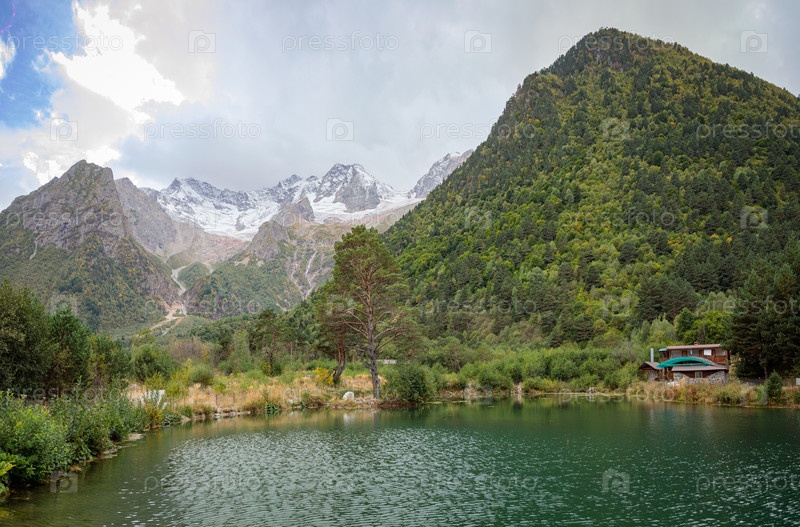 Горный пейзаж с ледником на расстоянии. Озеро в горах. Ледник Тана в Осетии