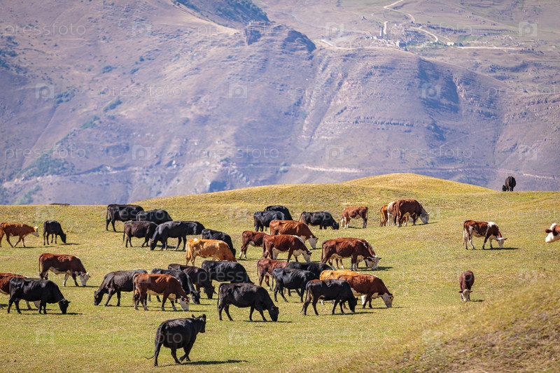 Стадо коров пасется на лугах Кавказских гор