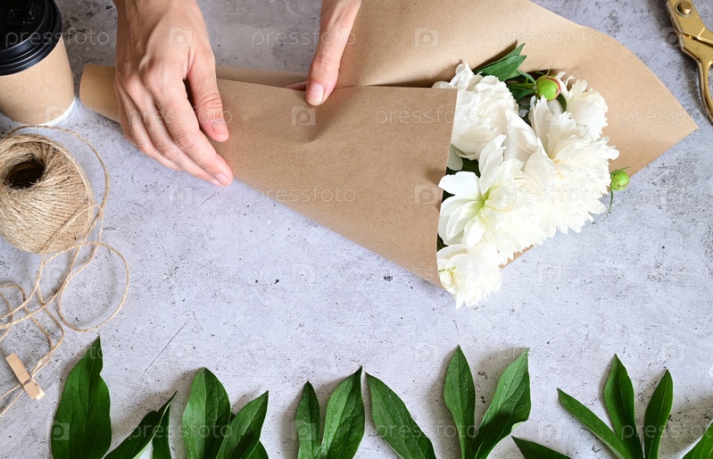 Женщина делает букет пионов, букет из крафт бумаги., обрезка цветов, столпник делает букет