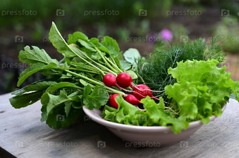 Свежий красный редис в белом дуршлаге. Фермерские органические овощи. Серый фон. Вид сверху