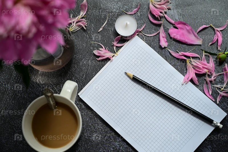 Офисный стол, вид сверху. Рабочее место с пустым блокнотом, канцелярскими принадлежностями, карандашом и кофейными чашками на темном фоне