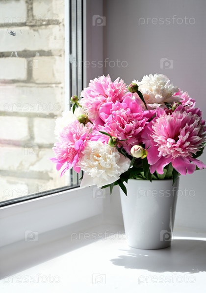 Вид на букет розовых пионов, стоящих в вазе на окне. Концепция фона, цветы, праздник
