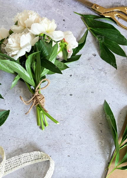 Женщина делает букет пионов, букет из крафт бумаги., обрезка цветов, столпник делает букет