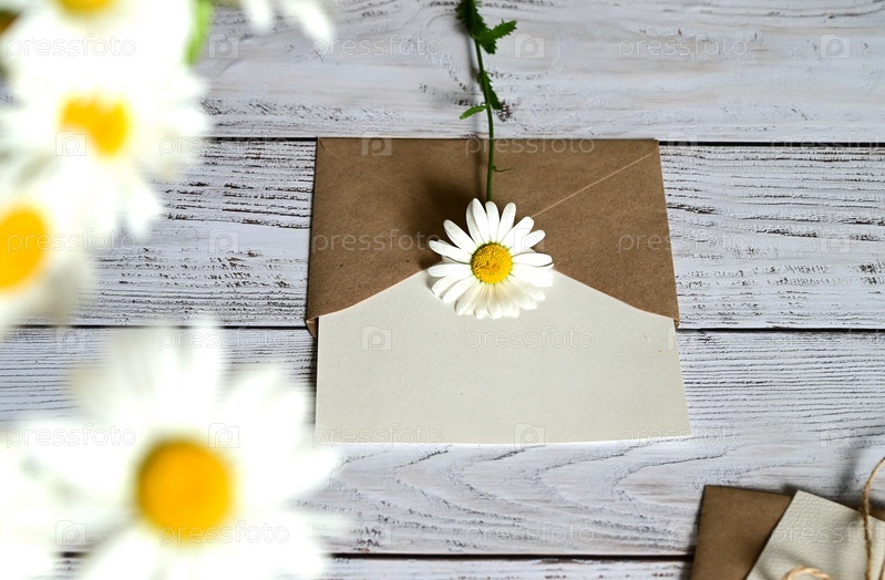 Пустая поздравительная открытка с коричневым конвертом и белым цветком для мамы на деревянном столе в винтажном стиле и с виньетками