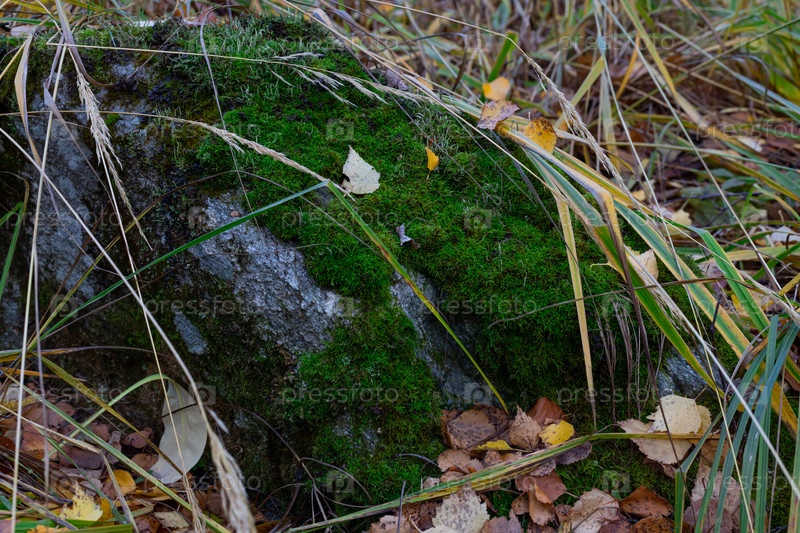 Ствол дерева, поросший с северной стороны мышевидной зеленью, на заднем плане