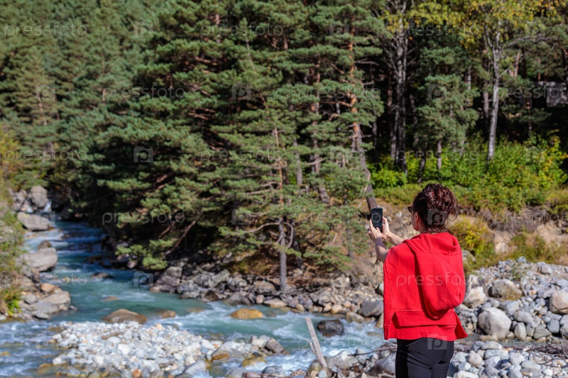Девушка путешествует по горам и фотографирует горную реку