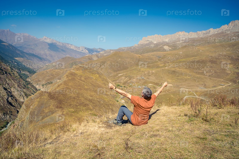 Мужчина в горах с распростертыми объятиями смотрит вдаль, наслаждаясь пейзажем гор