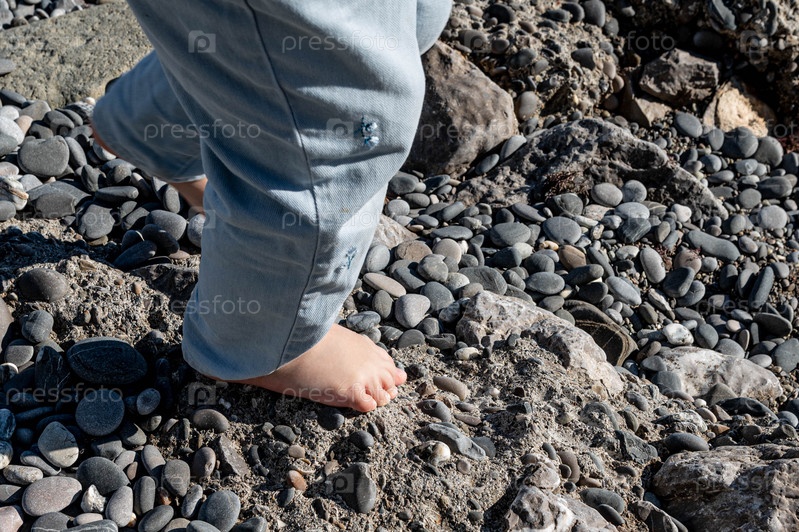 Ребенок босиком на пляже около черного моря