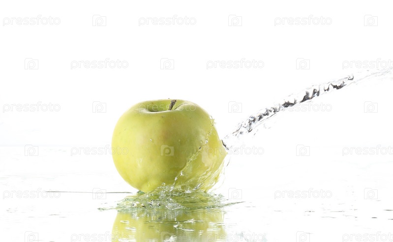 Зеленое яблоко в воде , изолированное на белом