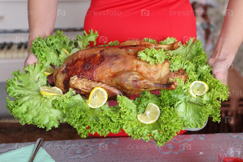 Женсккие руки держат поднос с жареным гусем