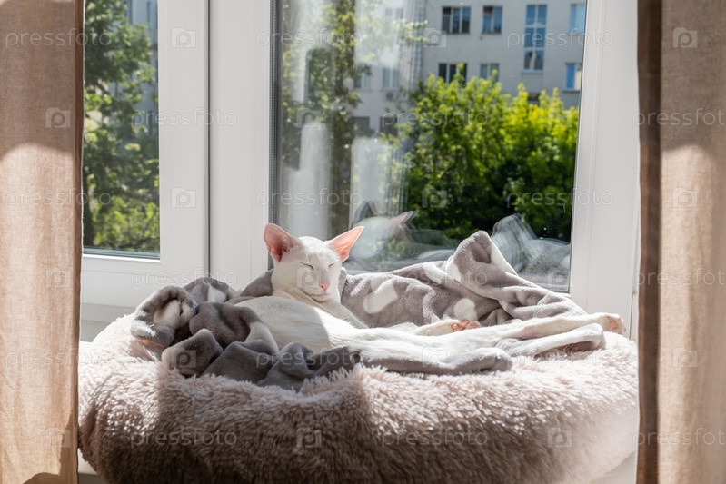 Ориентальная короткошерстная белая кошка лежит у окна