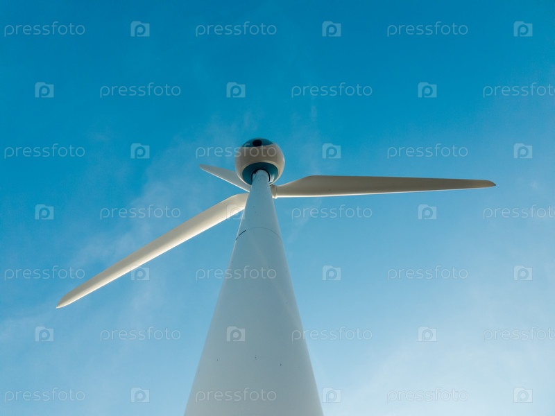 Ветряная турбина или ветряная мельница на фоне голубого неба, изображение крупным планом, концепция экологии
