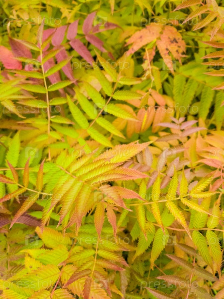 Зеленые, красные и оранжевые листья рябины, осенний естественный фон