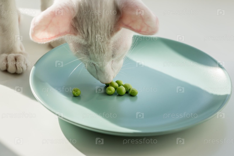 Белый кот ест зеленый сырой душистый горошек. Здоровая веганская еда