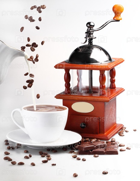 Молоко наливается в кружку с кофе на белом фоне