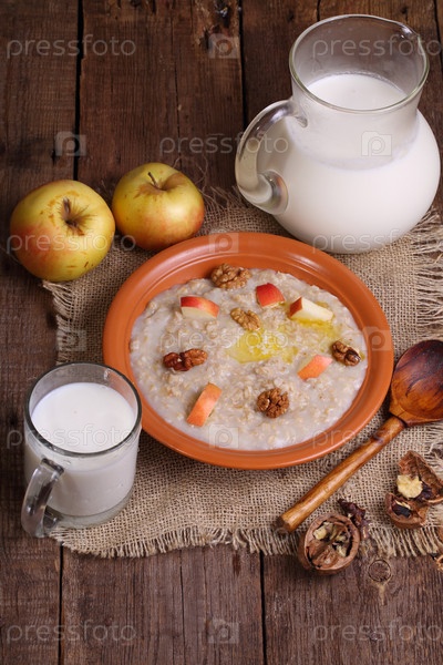 Овсянка с фруктами и молоком на деревянном столе