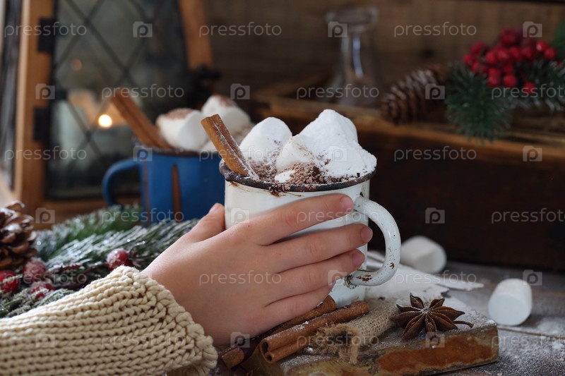 Детские руки держат кружку зефира и горячего шоколада