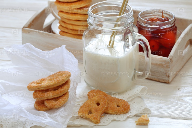Печенье с молоком и яблочным джемом на белом деревянном фоне