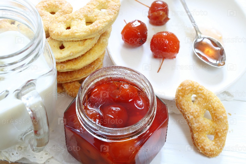 Печенье с молоком и яблочным джемом на белом деревянном фоне
