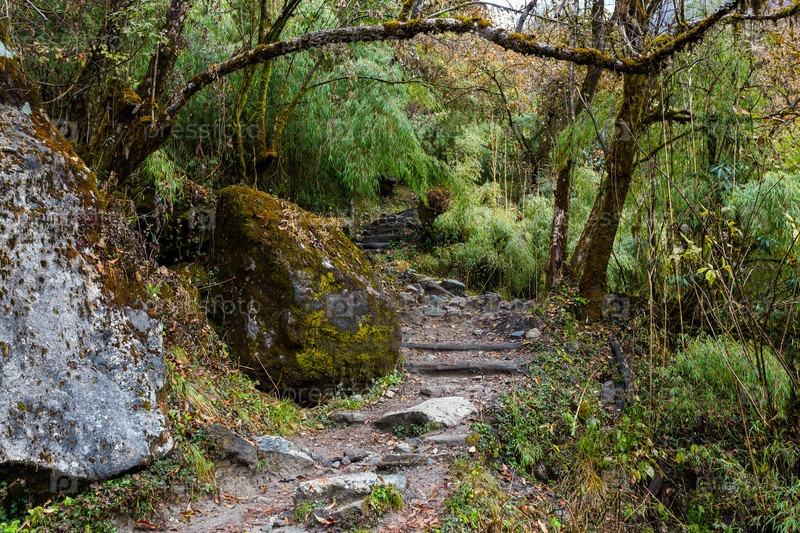 Каменная тропинка в зеленых тропических джунглях. Тропический лес в Непале, Гималаи
