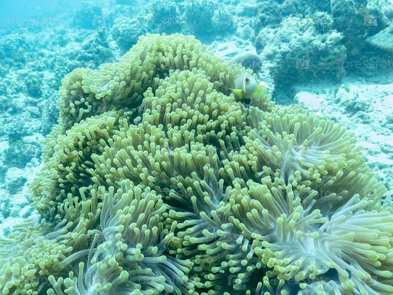 Рыба-клоун в морском анемоне в глубинах Индийского океана, Мальдивские острова