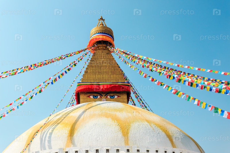 Молитвенные буддийские флаги развеваются на ветру на ступе Боднатх в Катманду, Непал
